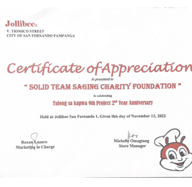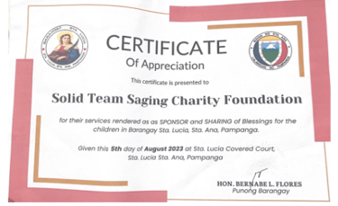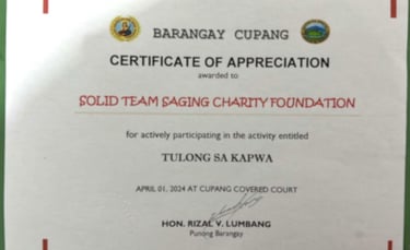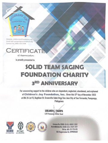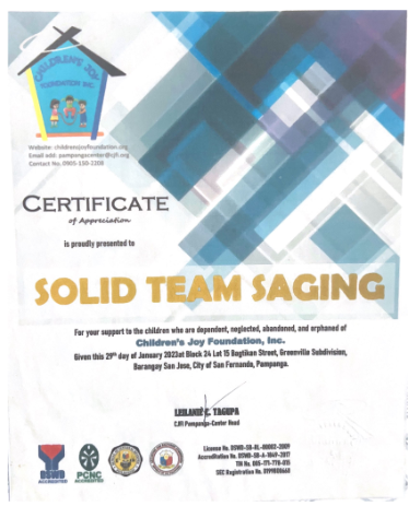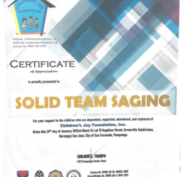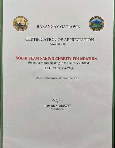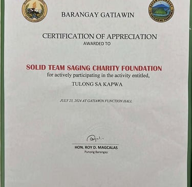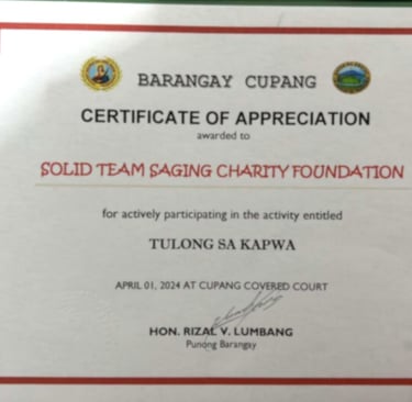 Solid Team Saging is founded November 13, 2020 . Solid Team Saging is a dedicated and passionate small group that extends its support to orphanages, street children, and the less fortunate in the Philippines. Their primary focus is on assisting children in the Philippines who are in need. This dedicated team works tirelessly to provide essential aid, including providing basic necessities,school supplies, shoes, slippers, cash assistant, and emotional support. Solid Team Saging's commitment to making a positive impact in the lives of these vulnerable children is evident through their unwavering efforts to create a more inclusive and nurturing environment for them. Their compassionate approach and global outreach make them a valuable asset in improving the lives of those who are most vulnerable.